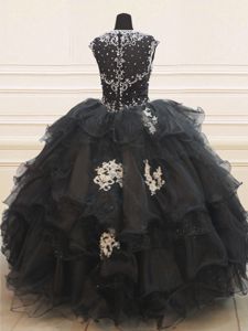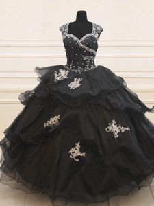 Graceful Black Cap Sleeves Beading and Appliques and Ruffles Floor Length Quinceanera Gown