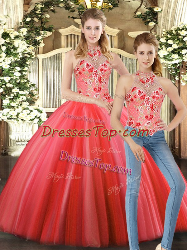 Graceful Coral Red Lace Up Halter Top Embroidery 15 Quinceanera Dress Tulle Sleeveless