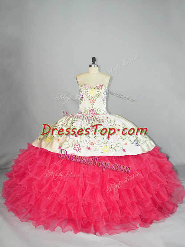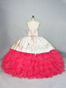 Graceful Floor Length White And Red Sweet 16 Quinceanera Dress Organza Sleeveless Embroidery and Ruffles