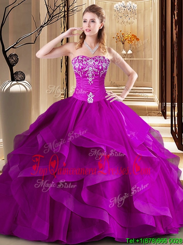Graceful Fuchsia Lace Up Sweetheart Embroidery and Ruffles Vestidos de Quinceanera Tulle Sleeveless