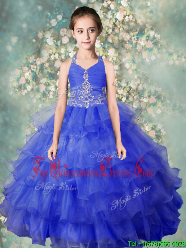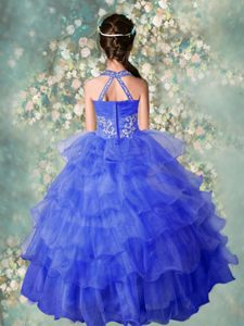Graceful Halter Top Baby Blue Organza Zipper Glitz Pageant Dress Sleeveless Floor Length Beading and Ruffled Layers
