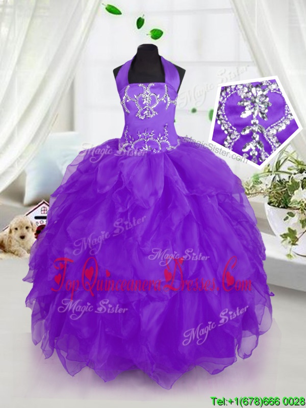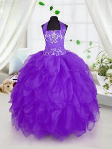Graceful Halter Top Sleeveless Lace Up Little Girl Pageant Gowns Purple Organza