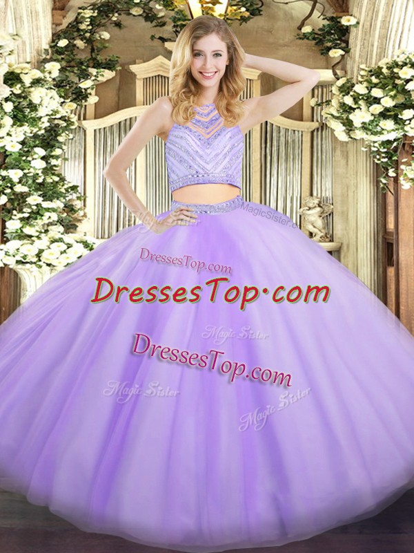 Graceful Lavender Two Pieces Tulle Scoop Sleeveless Beading Floor Length Zipper Quinceanera Gown