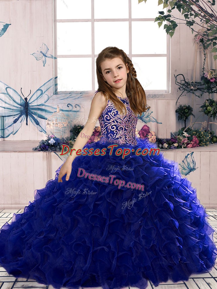 Graceful Royal Blue Lace Up Scoop Beading and Ruffles Girls Pageant Dresses Organza Sleeveless