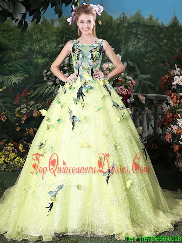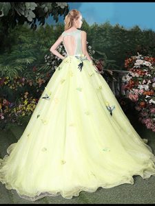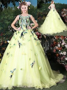 Graceful Scoop Light Yellow Ball Gowns Appliques Quinceanera Gowns Zipper Organza Sleeveless