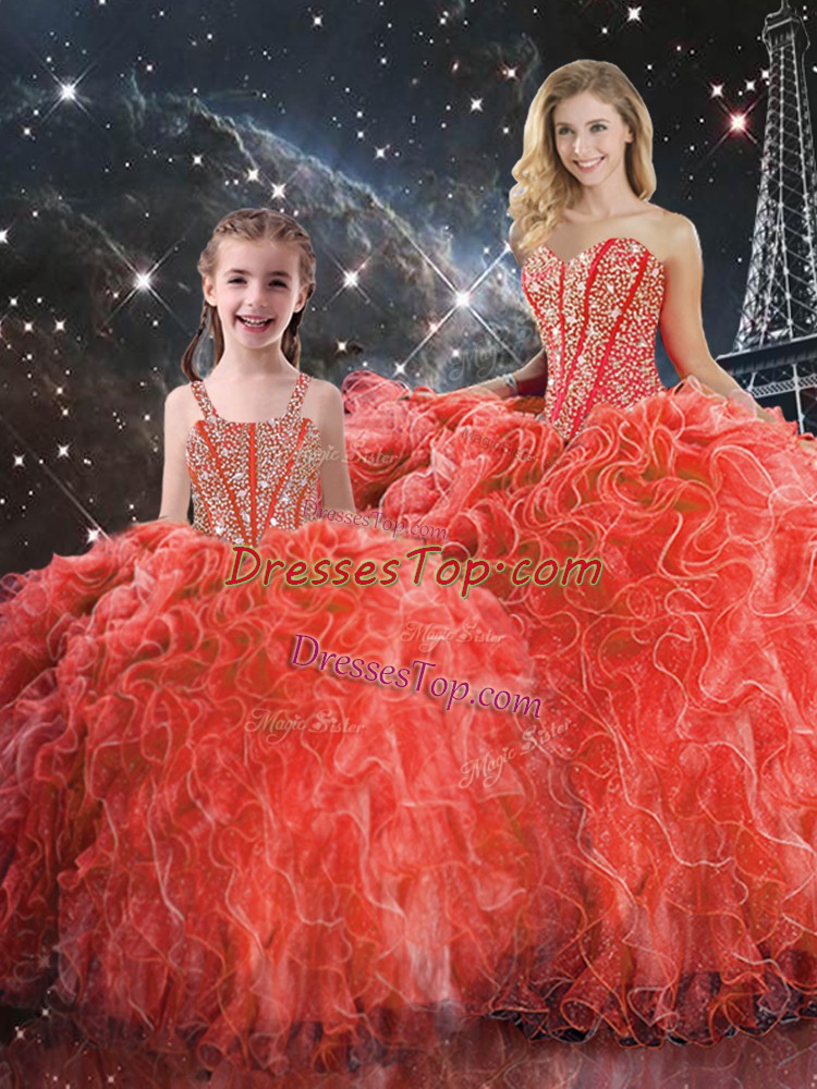 Graceful Sleeveless Floor Length Beading and Ruffles Lace Up Quinceanera Dresses with Coral Red