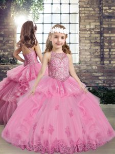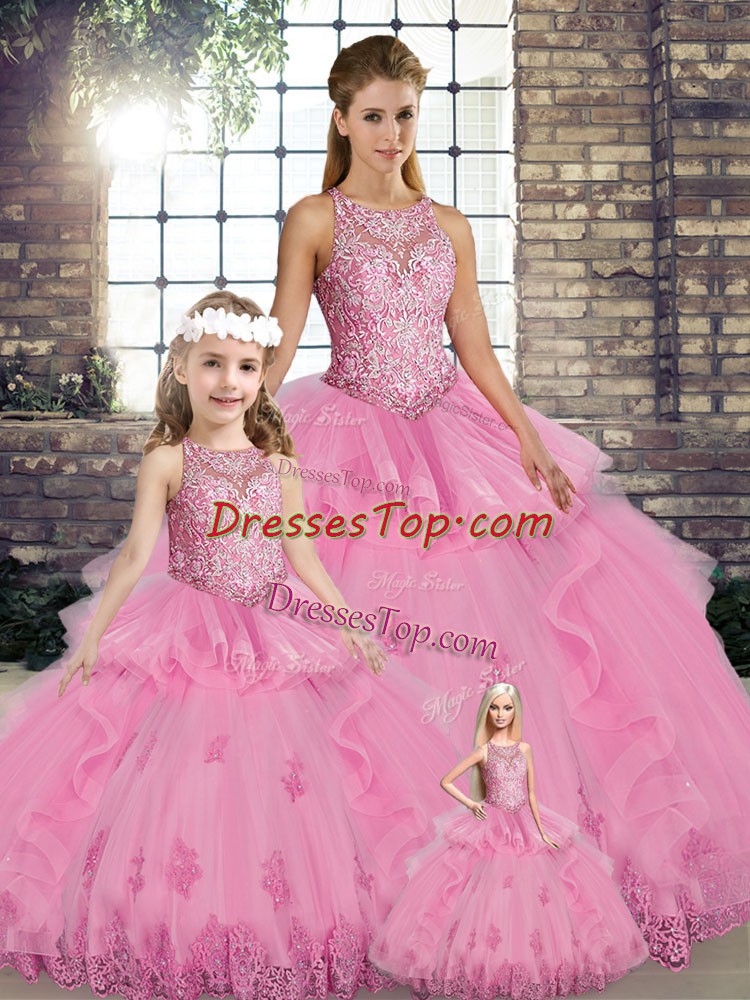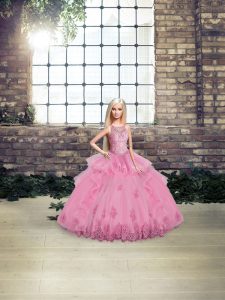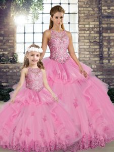 Graceful Sleeveless Floor Length Lace and Embroidery and Ruffles Lace Up Sweet 16 Dress with Rose Pink