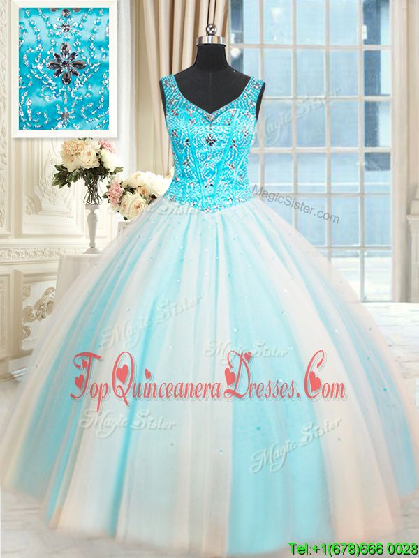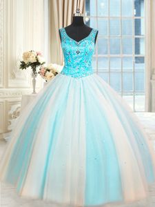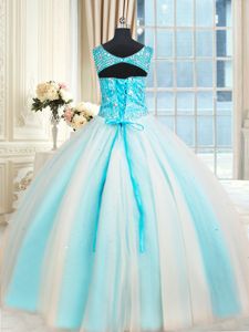Graceful Sleeveless Tulle Floor Length Lace Up Vestidos de Quinceanera in White and Blue for with Beading