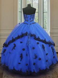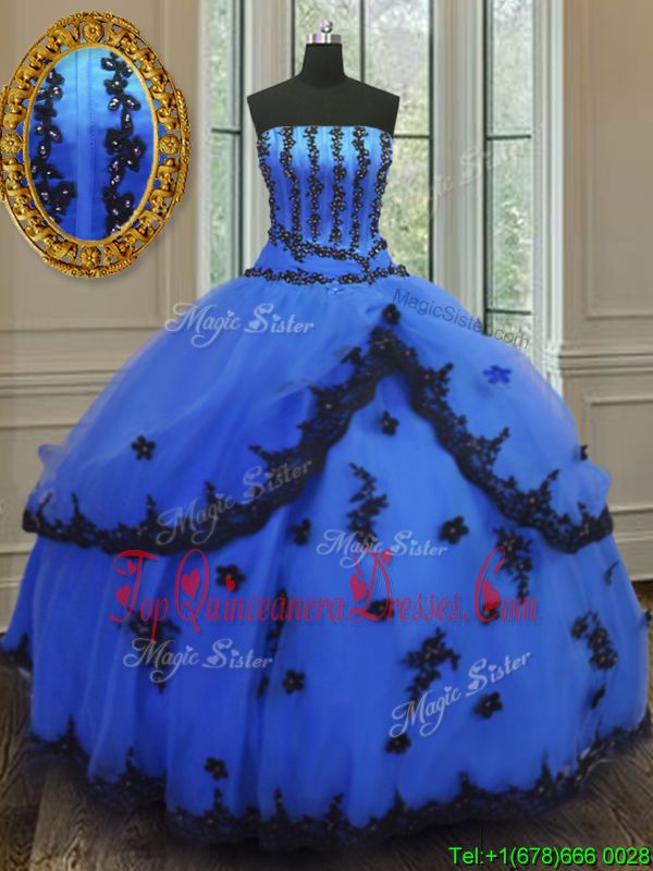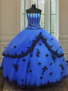 Graceful Strapless Sleeveless Vestidos de Damas Floor Length Appliques Blue Tulle
