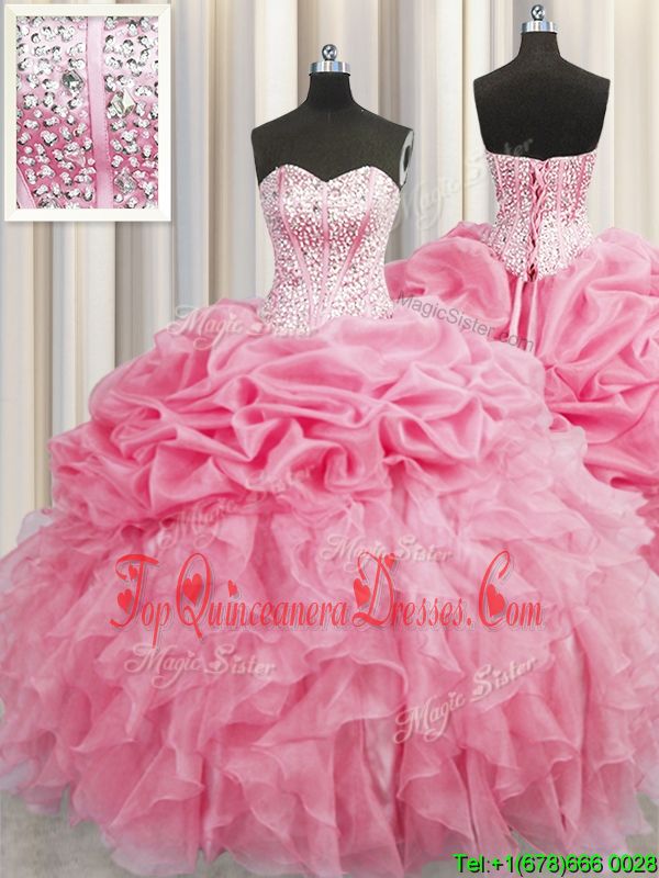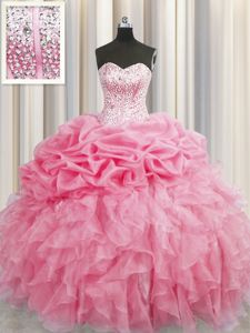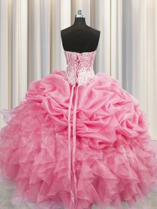 Graceful Visible Boning Rose Pink Quince Ball Gowns Military Ball and Sweet 16 and Quinceanera and For with Beading and Ruffles Sweetheart Sleeveless Lace Up