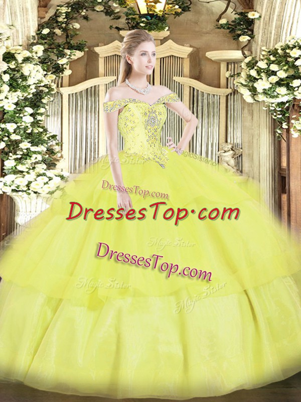 Graceful Yellow Off The Shoulder Lace Up Beading and Ruffled Layers Quinceanera Dresses Sleeveless