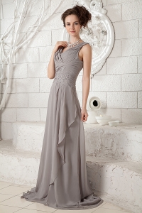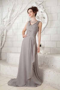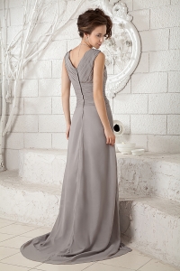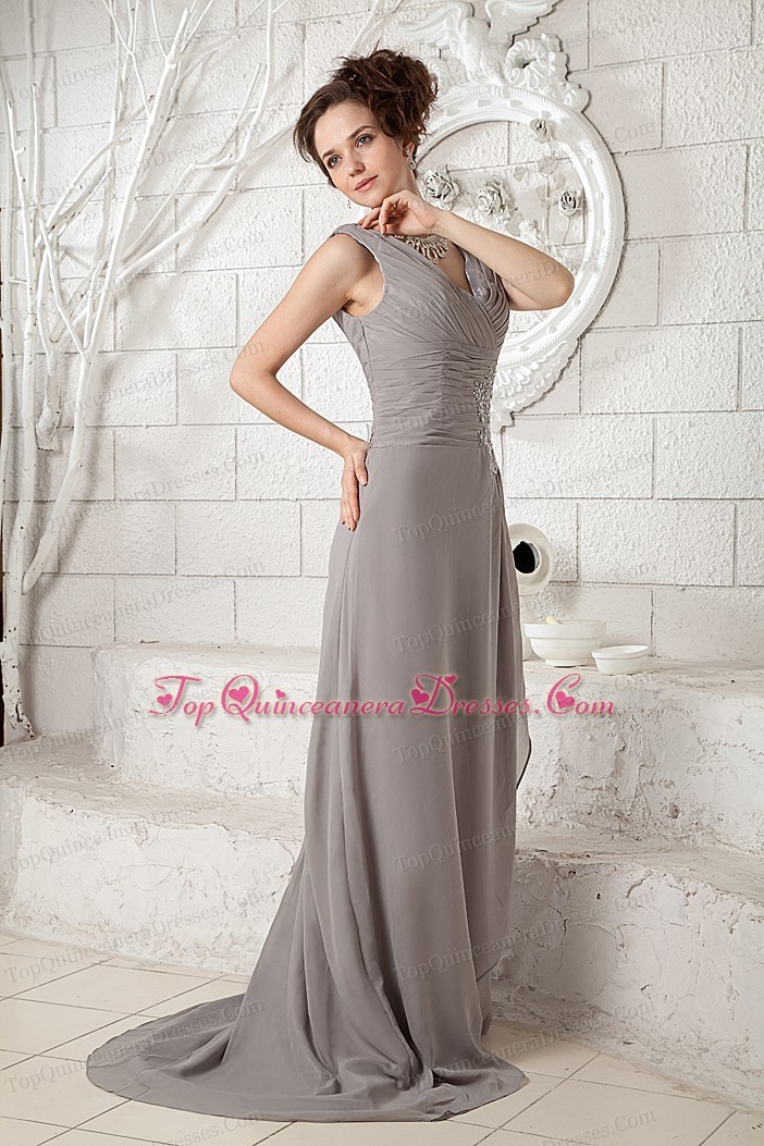 Gray V-neck Brush Train Chiffon Ruch Dama dresses for Quinces