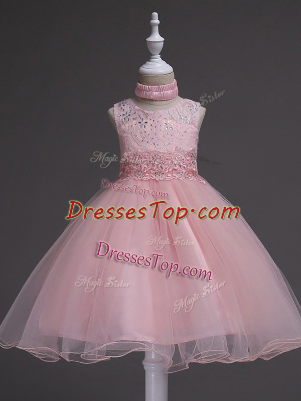 Great Baby Pink Scoop Neckline Beading and Lace Kids Pageant Dress Sleeveless Zipper