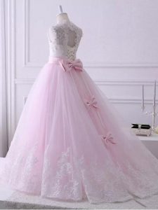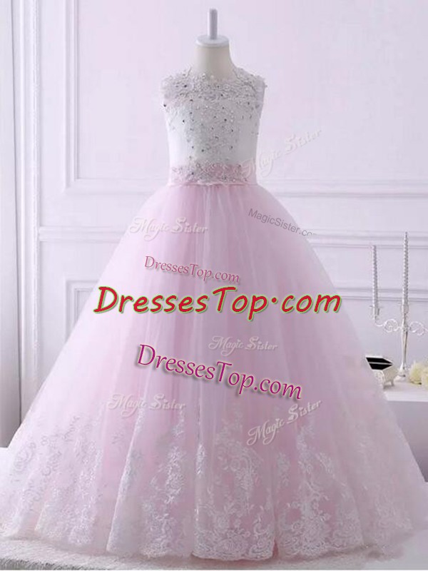 Great Baby Pink Tulle Lace Up Scalloped Sleeveless Little Girls Pageant Gowns Brush Train Lace