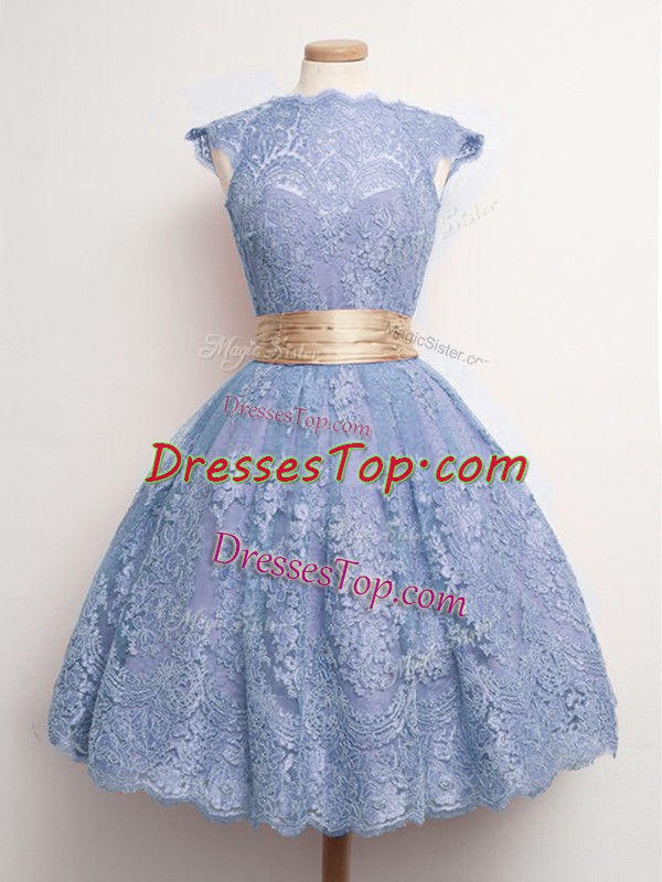 Great Blue Lace Up High-neck Belt Vestidos de Damas Lace Cap Sleeves