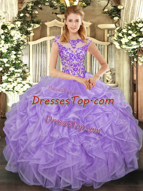 Great Cap Sleeves Organza Floor Length Lace Up Quince Ball Gowns in Lavender with Beading and Appliques and Ruffles