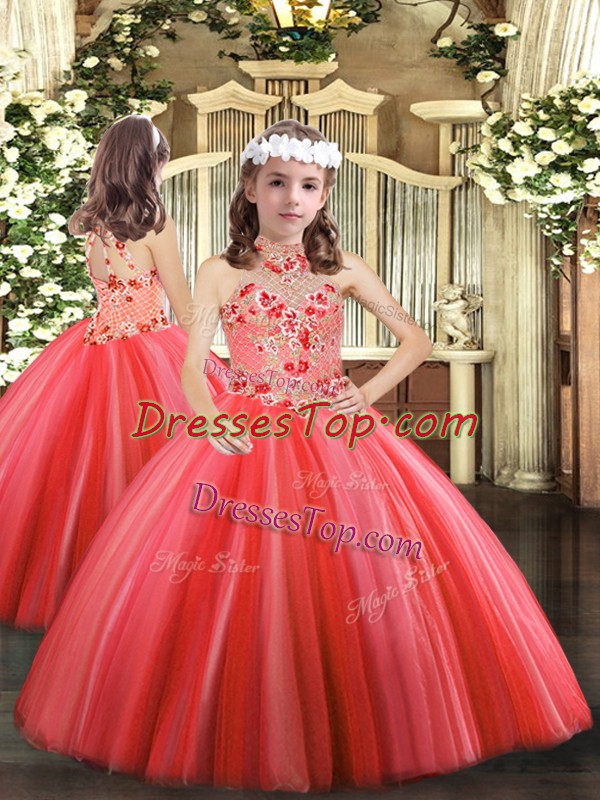 Great Coral Red Ball Gowns Appliques Little Girl Pageant Dress Lace Up Tulle Sleeveless Floor Length