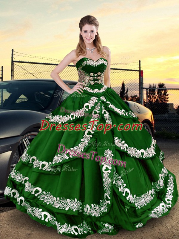 Great Dark Green Ball Gowns Appliques and Ruffled Layers 15 Quinceanera Dress Lace Up Satin Sleeveless Floor Length