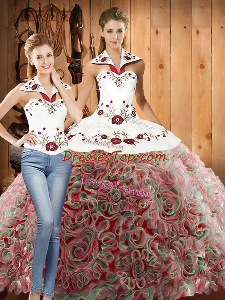 Great Fabric With Rolling Flowers Halter Top Sleeveless Sweep Train Lace Up Embroidery Quinceanera Gowns in Multi-color
