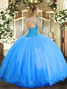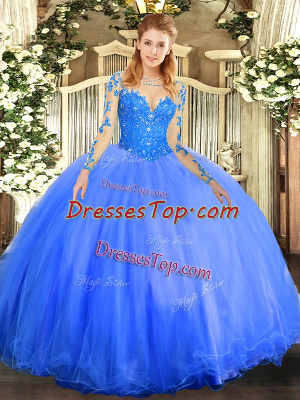 Great Floor Length Blue Quince Ball Gowns Tulle Long Sleeves Lace
