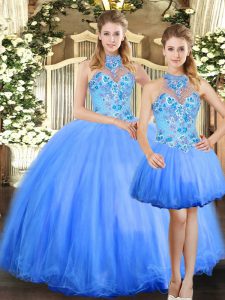 Great Floor Length Blue Quinceanera Gown Halter Top Sleeveless Lace Up