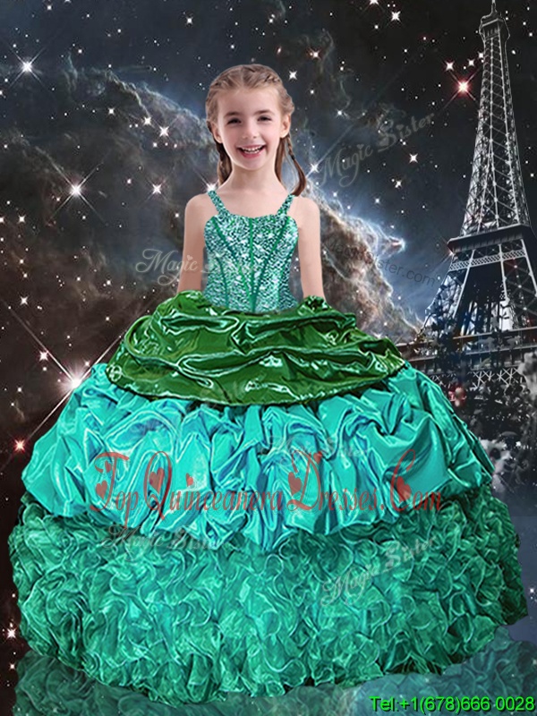 Great Green Ball Gowns Spaghetti Straps Sleeveless Organza Floor Length Lace Up Beading and Ruffles Kids Formal Wear