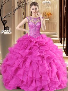 Great Hot Pink Ball Gowns Scoop Sleeveless Organza Floor Length Lace Up Beading and Ruffles Quinceanera Gowns