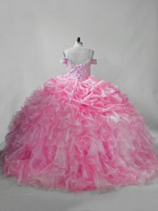 Great Lace Up Quinceanera Gowns Pink for Sweet 16 and Quinceanera with Beading and Ruffles and Pick Ups Brush Train