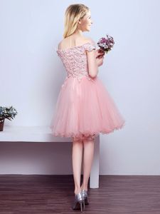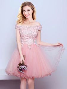 Great Off The Shoulder Sleeveless Quinceanera Court of Honor Dress Mini Length Beading and Lace Pink Tulle