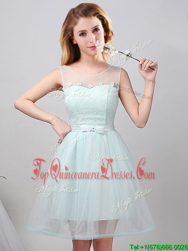 Great Scoop Apple Green Sleeveless Mini Length Lace and Appliques and Belt Lace Up Damas Dress