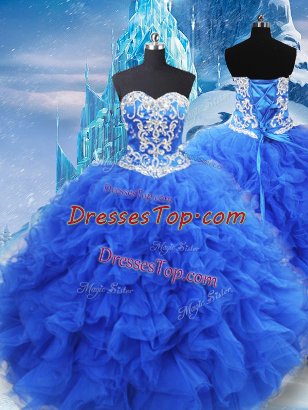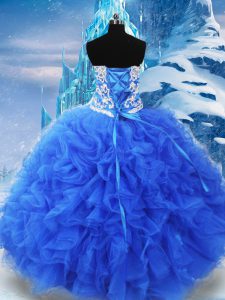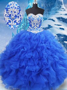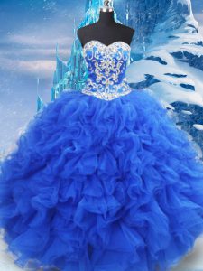 Great Sweetheart Sleeveless Ball Gown Prom Dress Floor Length Beading and Ruffles Blue Organza