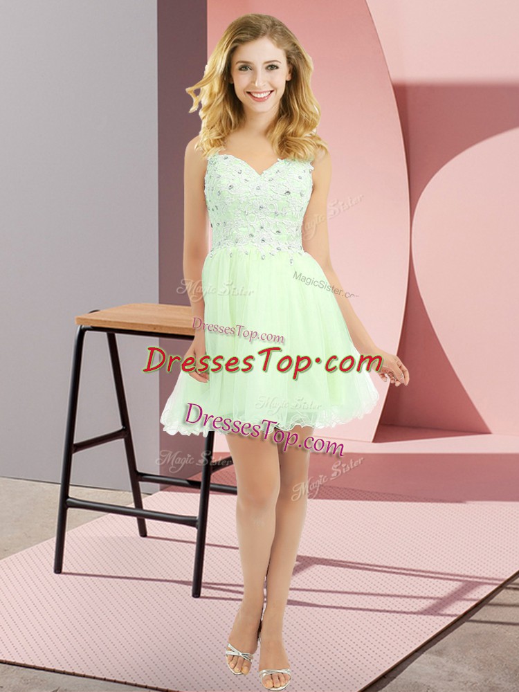 Great V-neck Sleeveless Court Dresses for Sweet 16 Mini Length Beading and Lace Yellow Green Tulle