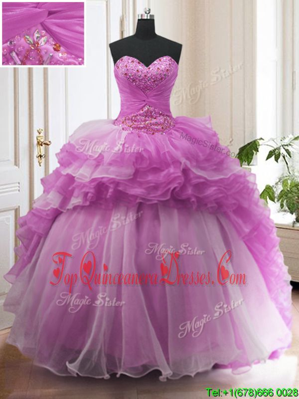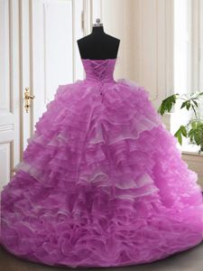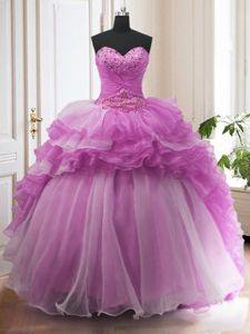 Great With Train Lilac Quinceanera Dresses Organza Sweep Train Sleeveless Beading and Ruffled Layers