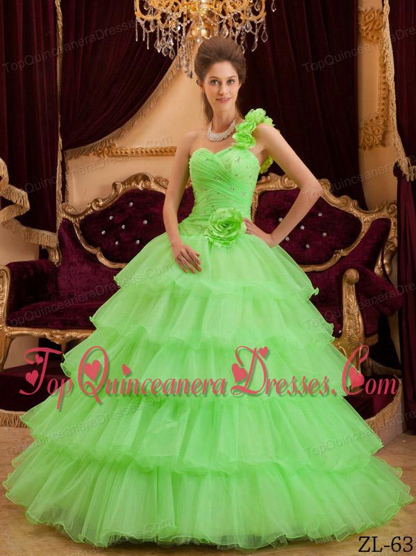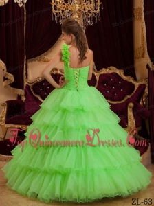 Green A-line / Princess One Shoulder Floor-length Ruffles Quinceanera Dress