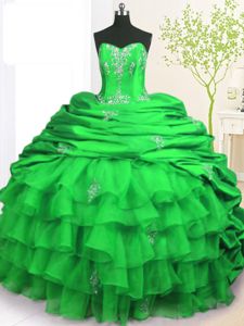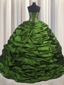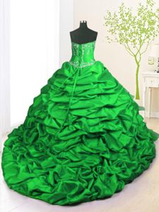 Green Ball Gowns Beading and Appliques and Pick Ups Quinceanera Gowns Lace Up Taffeta Sleeveless With Train