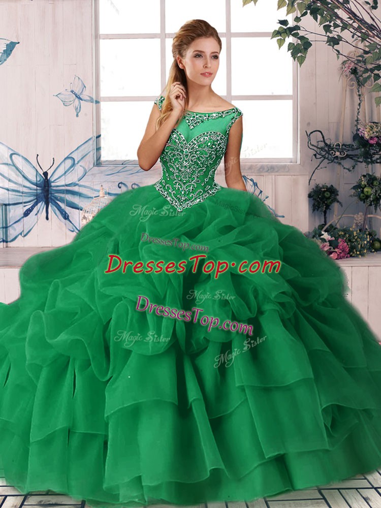 Green Ball Gowns Scoop Sleeveless Organza Brush Train Zipper Beading and Pick Ups Ball Gown Prom Dress
