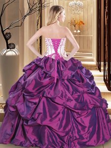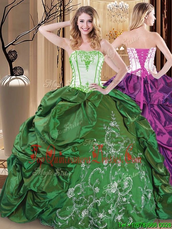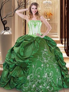 Green Ball Gowns Strapless Sleeveless Taffeta Floor Length Lace Up Embroidery 15th Birthday Dress