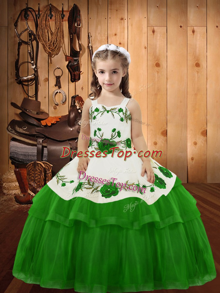 Green Ball Gowns Straps Sleeveless Organza Floor Length Lace Up Embroidery and Ruffled Layers Little Girl Pageant Gowns