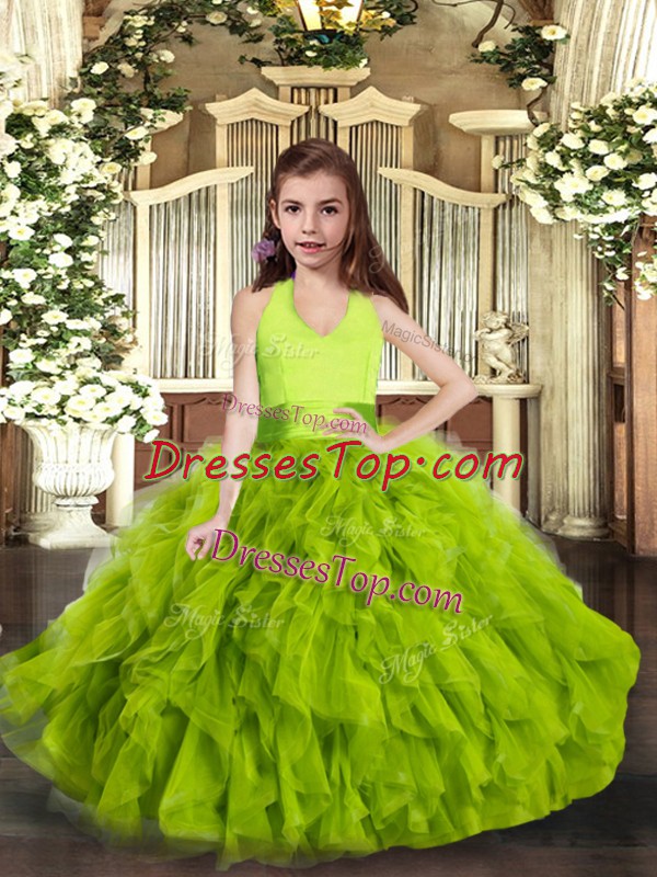 Green Ball Gowns Tulle Halter Top Sleeveless Ruffles Floor Length Lace Up Kids Pageant Dress