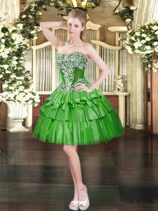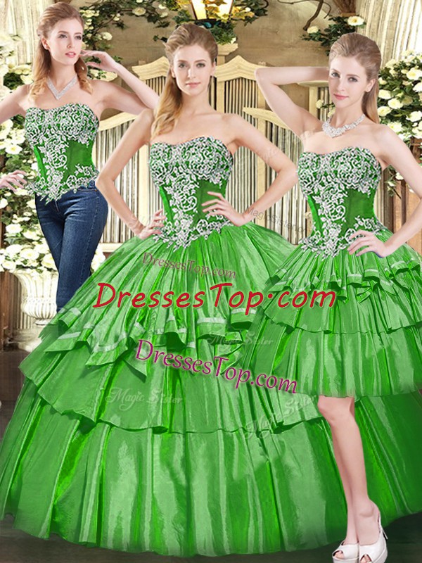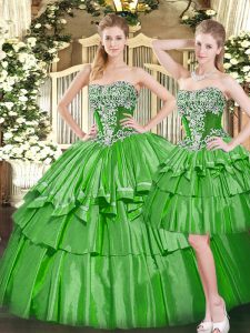Green Ball Gowns Tulle Strapless Sleeveless Beading and Ruffled Layers Floor Length Lace Up Quinceanera Dresses