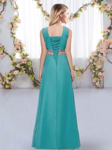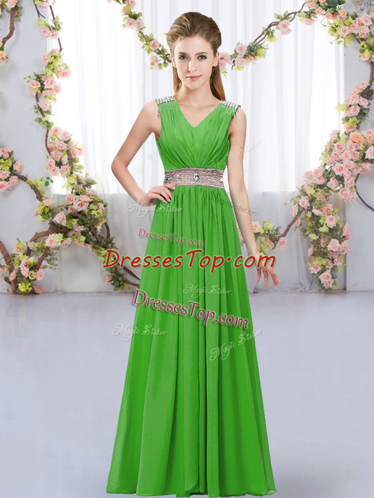 Green Empire Chiffon V-neck Sleeveless Beading and Belt Floor Length Lace Up Damas Dress