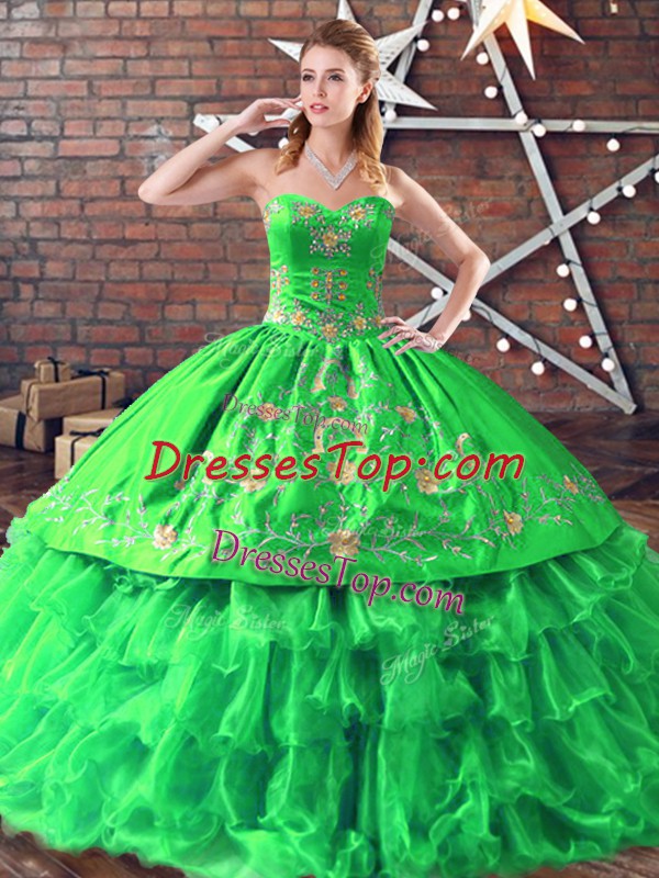 Green Organza Lace Up Ball Gown Prom Dress Sleeveless Floor Length Embroidery