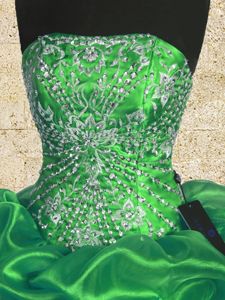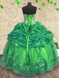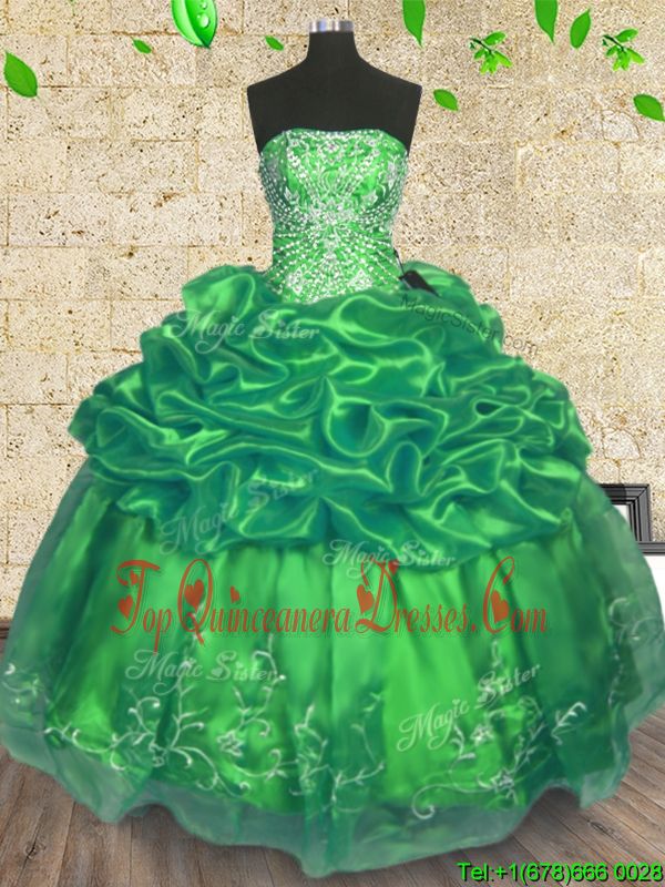 Green Organza Lace Up Strapless Sleeveless Floor Length 15 Quinceanera Dress Beading and Embroidery