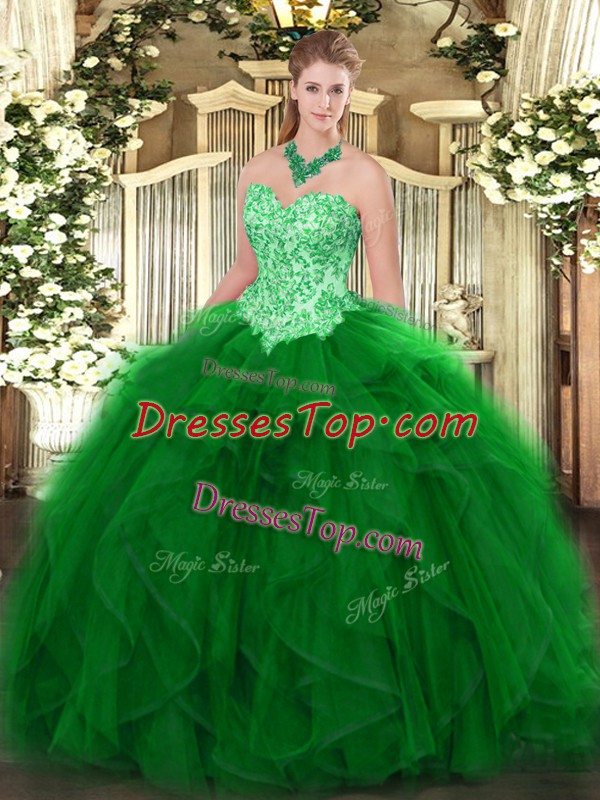 Green Organza Lace Up Sweet 16 Dress Sleeveless Floor Length Appliques and Ruffles
