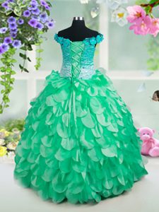Green Pageant Dress Wholesale Party and Wedding Party and For with Beading and Hand Made Flower Off The Shoulder Sleeveless Lace Up