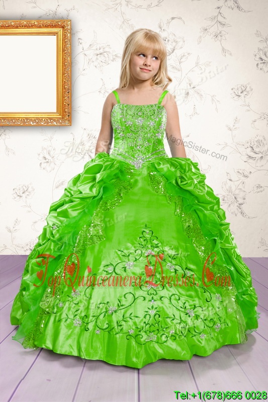 Green Satin Lace Up Spaghetti Straps Sleeveless Floor Length Glitz Pageant Dress Beading and Appliques and Pick Ups