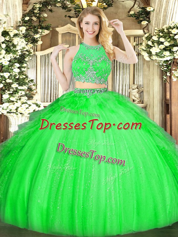Green Tulle Zipper Quinceanera Dress Sleeveless Floor Length Beading and Ruffles