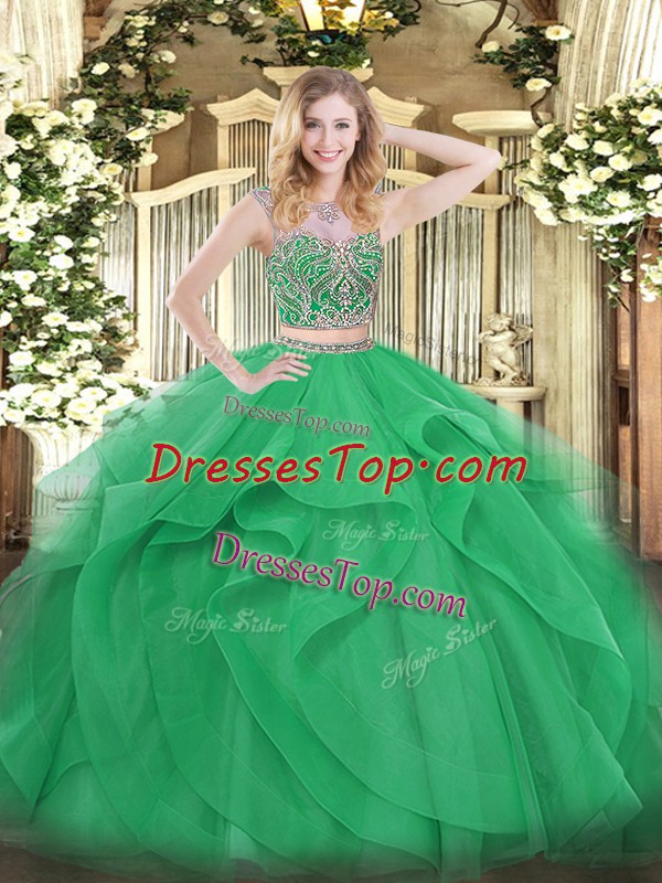 Green Two Pieces Beading and Ruffles 15 Quinceanera Dress Lace Up Tulle Sleeveless Floor Length