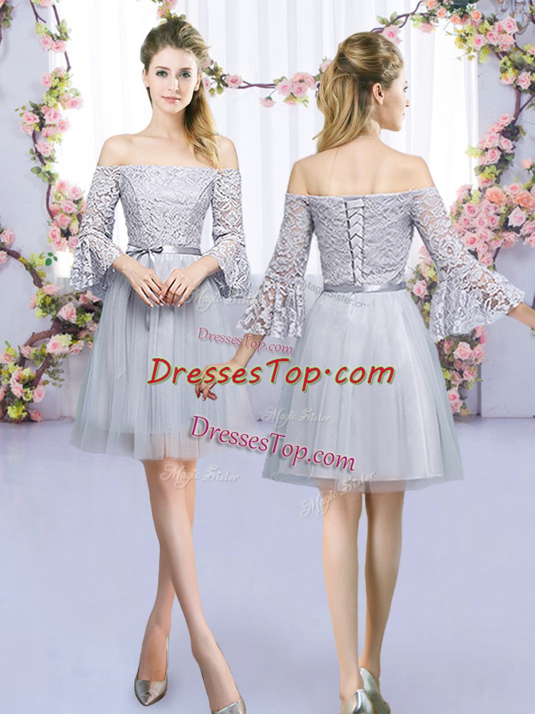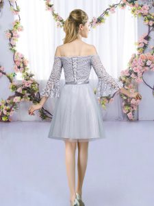 Grey 3 4 Length Sleeve Mini Length Lace and Belt Lace Up Quinceanera Dama Dress
