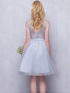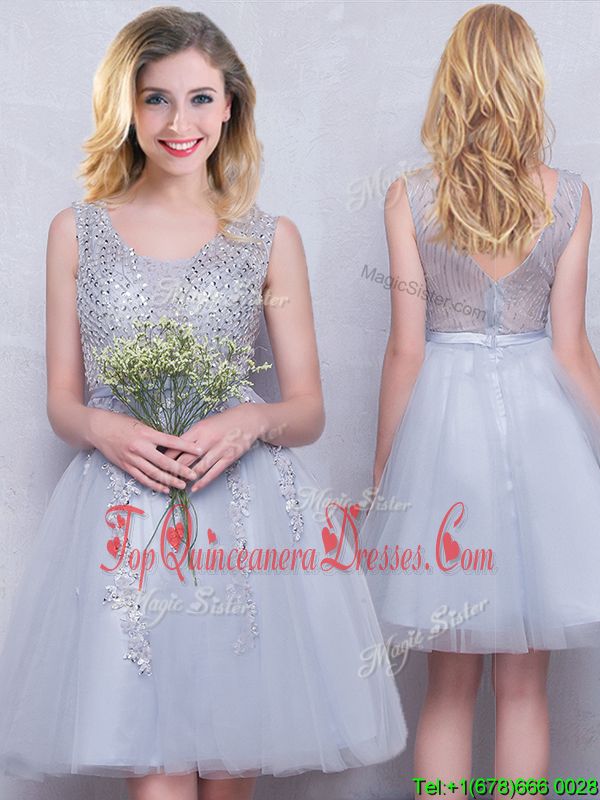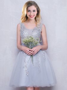 Grey A-line Scoop Sleeveless Tulle Mini Length Zipper Beading and Appliques Quinceanera Court Dresses